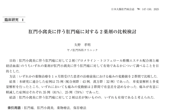 Yano T. A Comparison of Two Drug Treatments for Anal Cryptitis Pain. 日本大腸肛門病会誌. 2025;78(3).