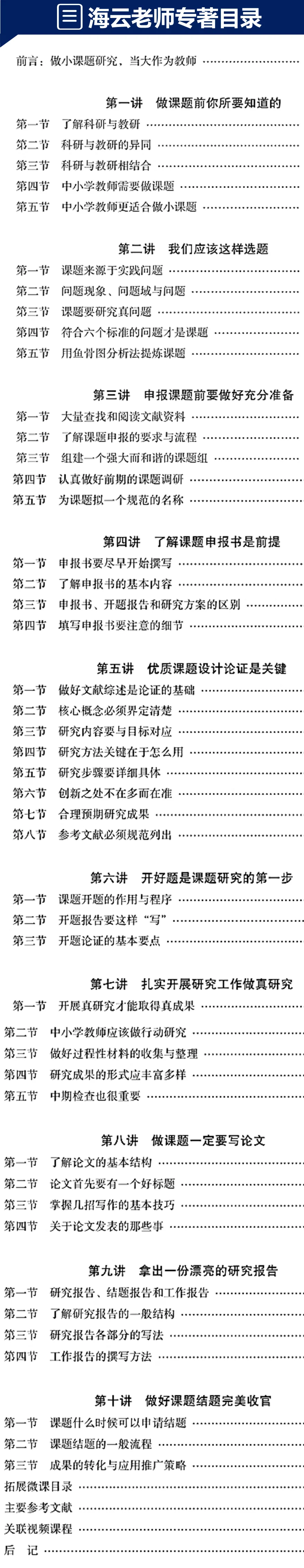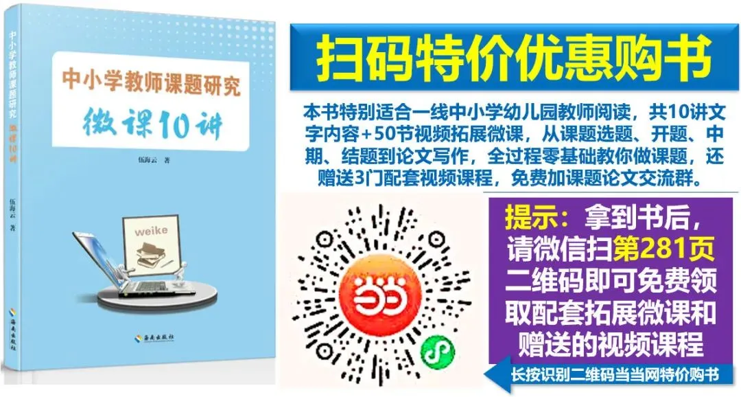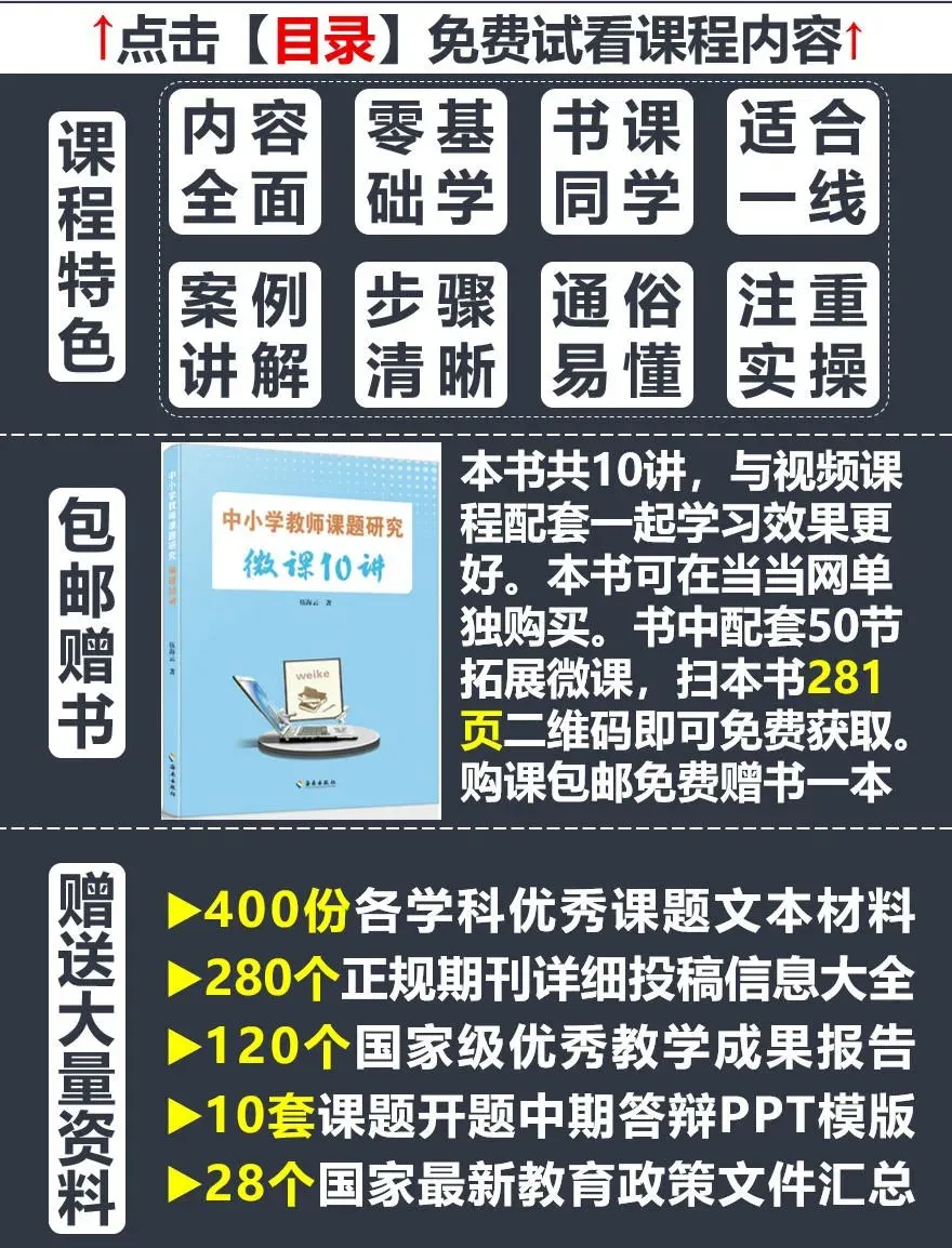 5.赠送配套书籍一本:包邮赠送课程配套专著《中小学教师课题研究微课10讲》纸质书一本(价值45元),概述包括15万文字内容+50节拓展微课,结合视频课程一起学习效果更好。