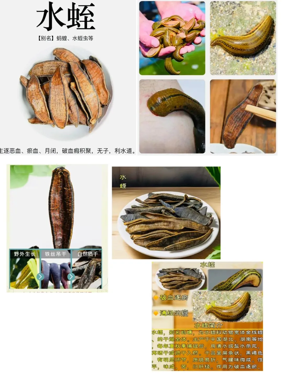 1)蚂蟥(宽体金线蛭):扁平纺锤形,长4-10cm,宽0.5-2cm。用水浸后,可见黑色斑点排成5条纵纹(关键特征)。前后各具一吸盘,后吸盘较大。