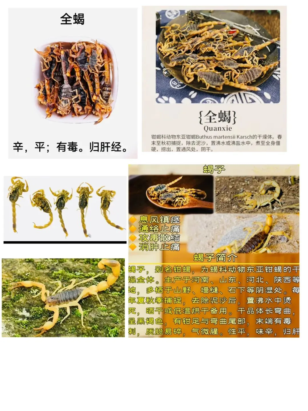 (6)联想记忆:全蝎如披甲武士,双钳一尾钩是其标志性武器。其毒能攻毒,其性善走窜,能深入经络,为治惊风抽搐、中风面瘫、顽固痹痛之要药。