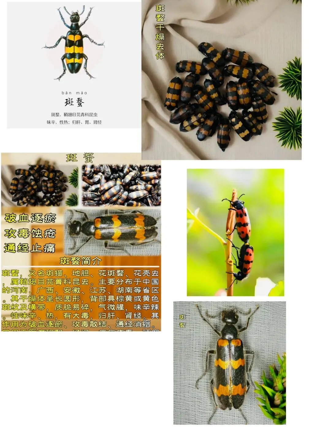 (4)联想记忆:“斑”指其艳丽警告色,“螯”寓其有毒。其臭气与醒目的黄黑相间色带是双重警告。毒性剧烈,外用蚀疮,内服破血,必须严格炮制(如米炒)并控制剂量。