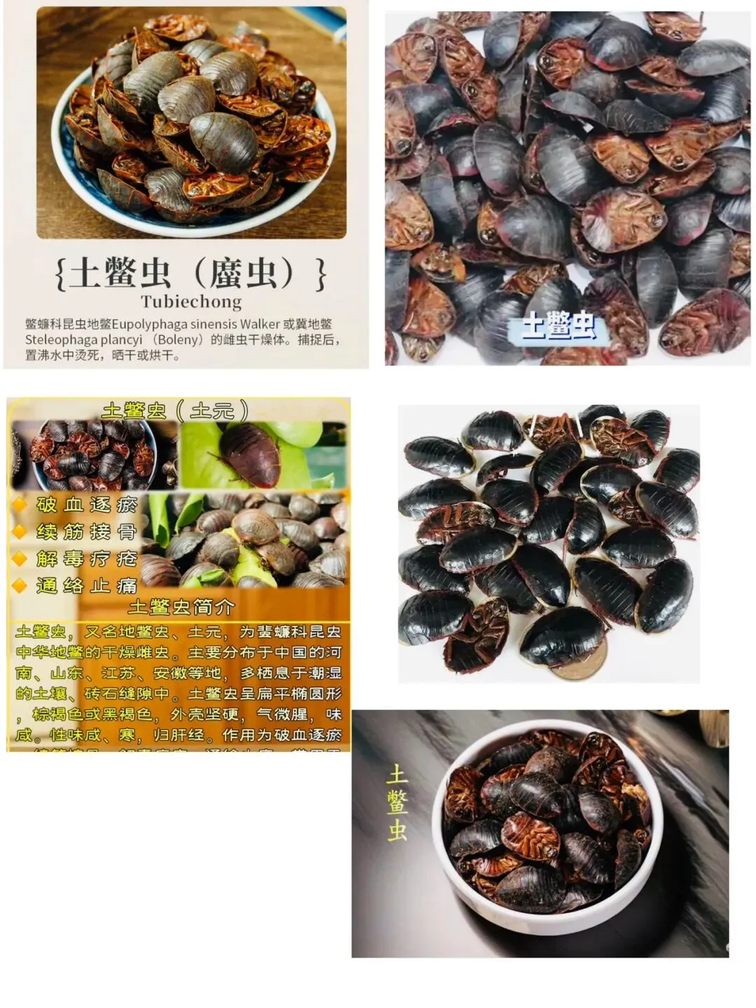 5.土鳖虫:认清是无翅的雌虫,背部紫褐色光泽是品质标志。