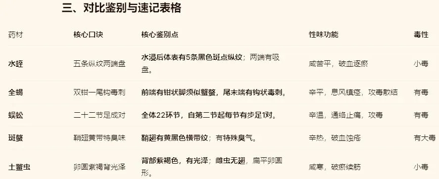 1.水蛭:务必做水浸实验,观察5条纵纹,这是与伪品(如蛞蝓干)区分的铁证。