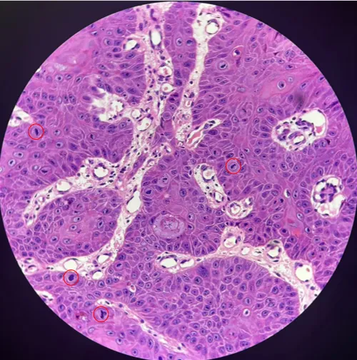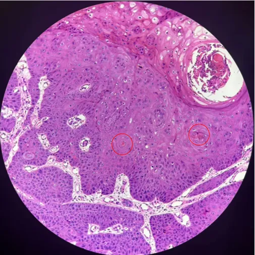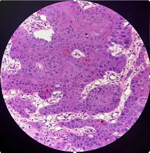 肿瘤由异型增生的鳞状上皮细胞构成,细胞大小不一、多形性明显;细胞核大、深染、核质比增高,核仁显著,可见病理性核分裂象讨 论