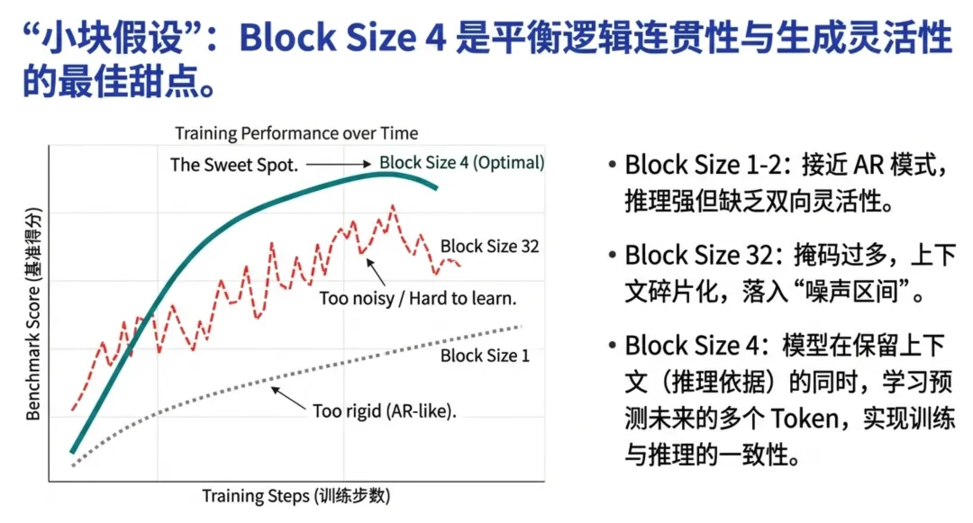 - 2. 小块扩散 (Small-Block Diffusion):将扩散单元限制在 block_size=4。这既保留了局部生成的灵活性,又在宏观上维持了代码的序列逻辑,实现了训练与推理的一致性(Alignment)。