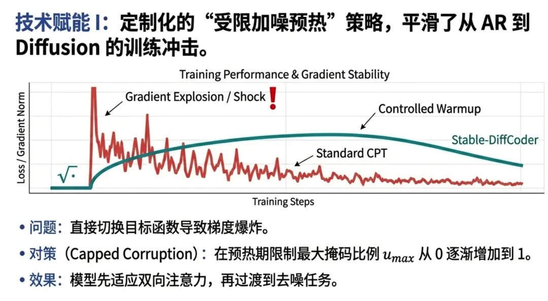 - 1. 课程学习 (Curriculum Design):采用 "AR First, Diffusion Second" 策略。先用 AR 模式高效压缩知识,再通过扩散模式进行“内化”和“重组”。这避免了模型在训练初期因掩码过多而“迷失方向”。