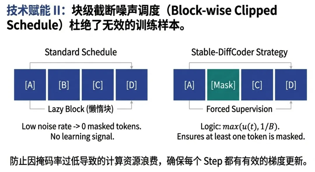 - 3. 截断噪声调度 (Block-wise Clipped Noise):这是本文最大的技术亮点之一。 传统调度在小块训练时容易出现“空转”(即没有Token被Mask,导致零梯度)。团队设计了强制截断机制,确保每一步训练都有非零的监督信号,极大提升了算力利用率(Compute Efficiency)。