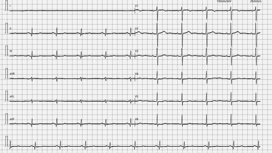 咱们不卖关子,遇到这种图,最大的特点就是I导联几乎呈一条直线,就是几乎看不清楚p-QRS波群了,称之为零电压。