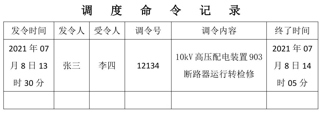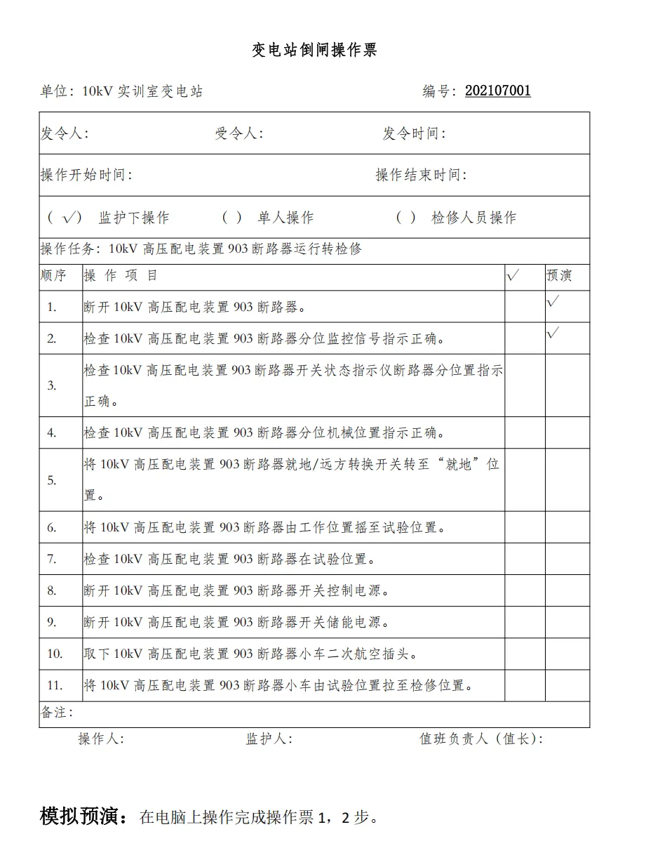 变电站值班长(受令人):你好,我是变电主值班长,***, 调度预令,调令号 12134,令将智能供配电实训室 10kV 高压配电装置 903 断路器运行转检修已经准备完成。调度值班员(发令人):你好,我是调度值班员,***,现在开始执行调令,调令号 12134,令将智能供配电实训室 10kV 高压配电装置903 断路器运行转检修,下令时间为 2021 年 07 月 8 日 13 时 30 分。变电站值班长(受令人):我是变电站值班长,***,现在开始执行调令,调令号 12134,令将智能供配电实训室 10kV 高压配电装置 903 断路器运行转检修,下令时间为 2021 年 07 月 8 日 13 时 30 分。