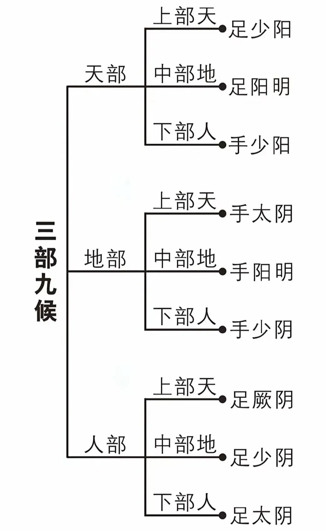 岐伯曰:有下部、有中部、有上部,部各有三候。三候者,有天、有地、有人也,必指而导之,乃以为真。