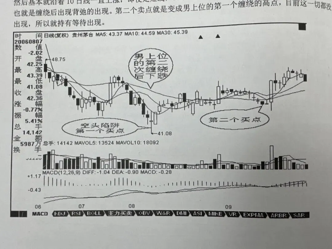 8月7日,男上位的第二次缠绕后下跌,但成交量等都明显出现背驰,构成小的空头陷阱,成为第一个买点在41元附近。