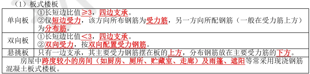 (1)钢筋混凝土楼板强度高、刚度好、耐久性好、防火性能好,且具有良好的可塑性,便于机械化施工等特点,是目前我国工业与民用建筑楼板的基本形式。