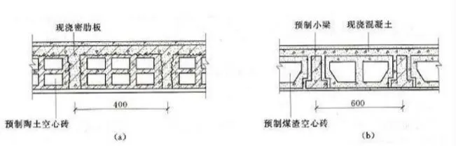 密肋填充块楼板的密肋小梁有现浇和预制两种。现浇密肋填充块楼板以陶土空心砖、矿渣混凝土空心块等作为肋间填充块,然后现浇密肋和面板。密肋填充块楼板底面平整,隔声效果好,能充分利用不同材料的性能,节约模板且整体性好。