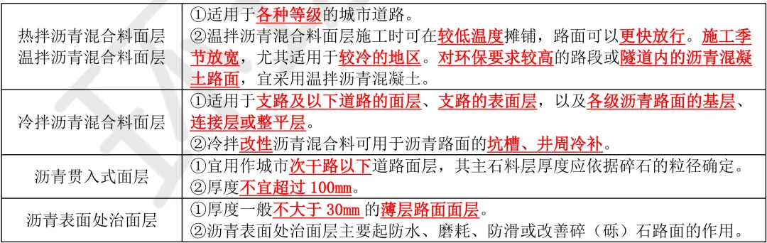 高级沥青路面面层可划分为上(表)面层、中面层、下(底)面层。沥青路面面层类型包括热拌沥青混合料面层、温拌沥青混合料面层、冷拌沥青混合料面层、沥青贯入式面层、沥青表面处治面层等。