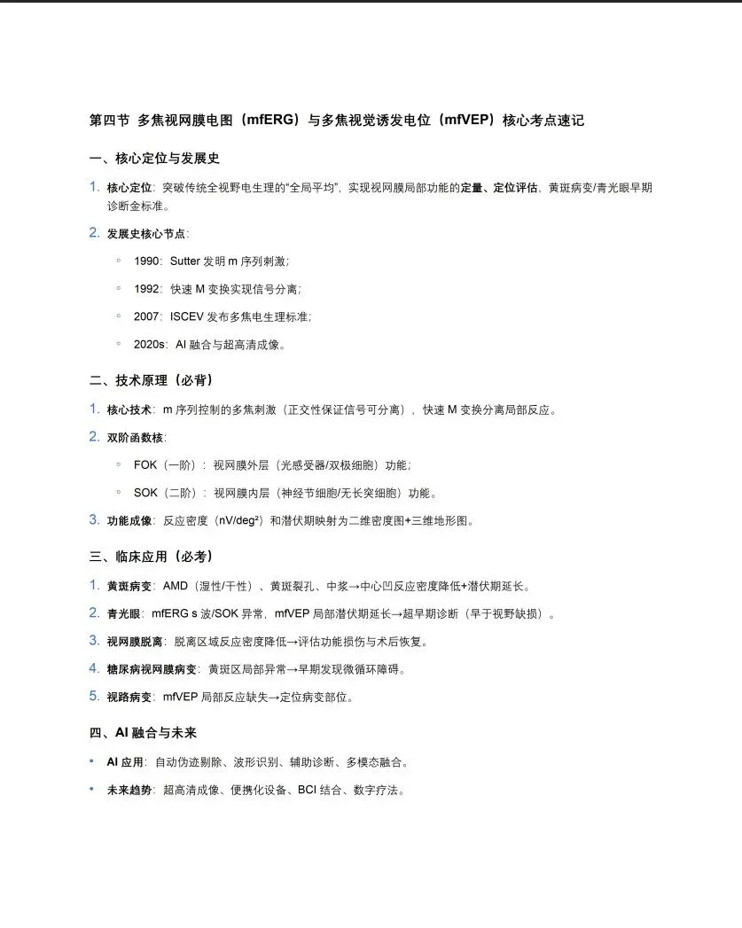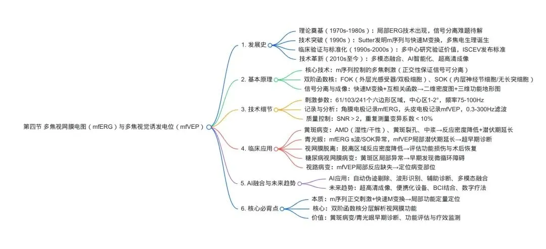 多焦电生理:发展史 → 基本原理(m序列/双阶核/信号分离) → 技术细节(刺激/记录/分析) → 临床应用(疾病对应+机制) → AI融合与未来趋势 |