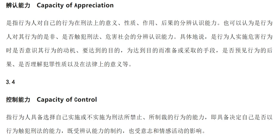 (2)辨认能力:一是精神病人的动机、目的是否荒谬离奇并脱离现实,二是精神病人是否曲解了危害行为的违法性质,三是精神病人对危害后果是否缺乏认识。