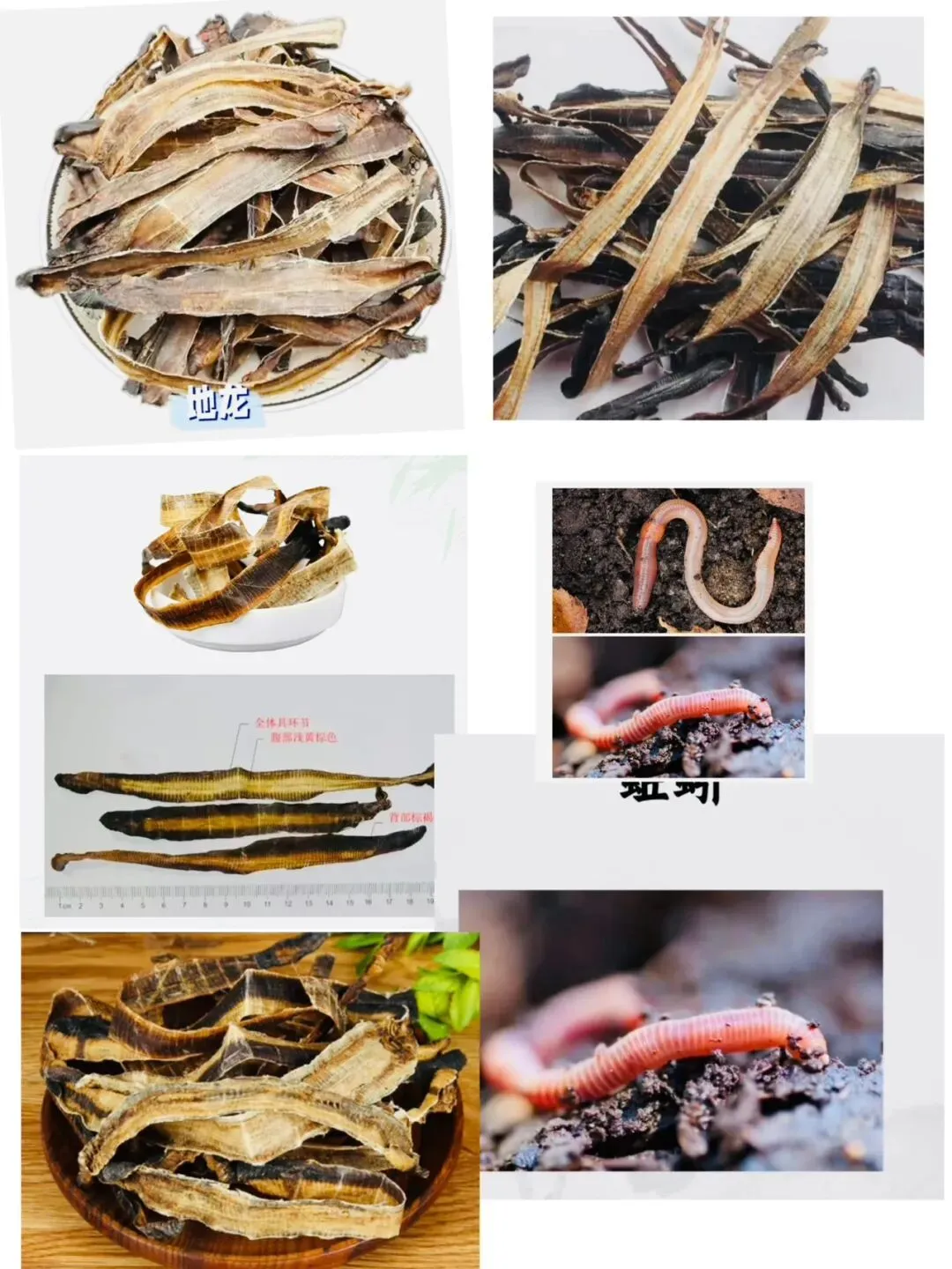 1)广地龙:呈长条状薄片,全体具明显环节。背部棕褐至紫灰色,腹部浅黄棕色。关键特征:在第14-16环节有一圈浅色(黄白色)增厚的生殖环带,习称“白颈”。