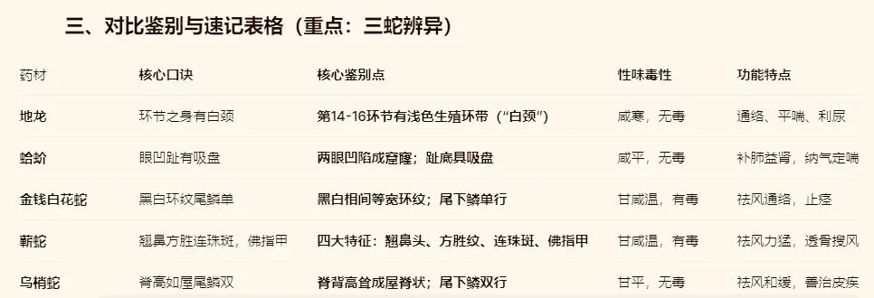 (5)联想记忆:蕲蛇为名贵蛇种,四大特征是其“身份证”,缺一不可。其祛风通络之力最为峻猛,能“内走脏腑,外达皮肤”,为治顽痹、疥癣、麻风之要药。