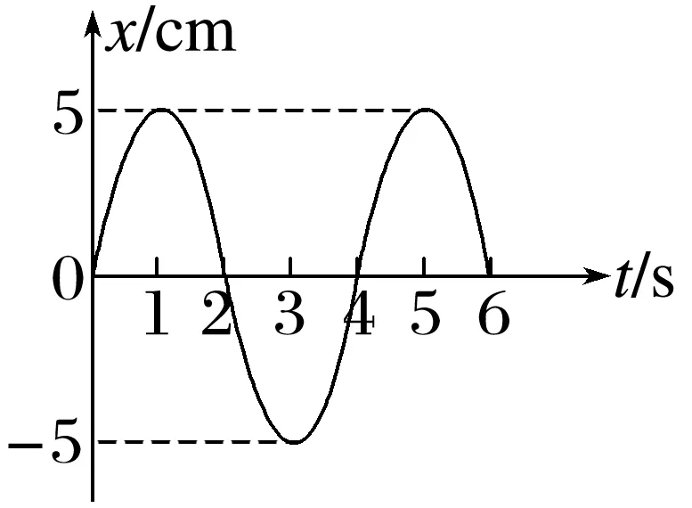 解析 由题图知弹簧振子的振幅为5 cm,振幅不随时间而变化,故A错误;t=1 s和t=3 s时,振子的位移大小相等,方向相反,根据F=-kx可知,振子的回复力方向相反,故B错误;在3~5 s内,振子由负向最大位移处先向平衡位置运动,再由平衡位置向正向最大位移处运动,则速度先增大后减小,故C错误;振子周期为4 s,则任意4 s内振子通过的路程为振幅的4倍即为20 cm,故D正确。