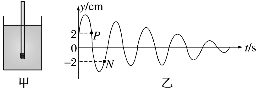 4.(2023·济宁市高二期末)粗细均匀的一根木筷,下端绕几圈铁丝,竖直浮在较大的水杯中,把木筷往上提起一段距离后放手,木筷就在水中上下振动,如图甲所示。以竖直向上为正方向,某时刻开始计时的振动图像如图乙所示。对于木筷(包括铁丝),下列说法正确的是( )