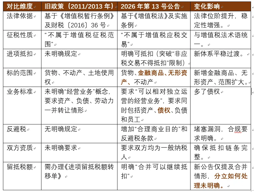 财政部 税务总局公告2026年第13号《关于增值税进项税额抵扣等有关事项的公告》于2026年1月30日发布,是《中华人民共和国增值税法》及实施条例的核心配套政策之一,自2026年1月1日起施行。这是增值税法实施后,对资产重组增值税政策的首次修订和明确。