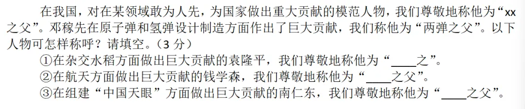 也就是说,孩子们都是带着自己的经验来到课堂的,当我们讲授的知识超过他们的理解的范围,那么让他们去接受这些知识就会变得非常困难。这也就能解释了为什么在下面的试题中,孩子们把袁隆平称为“杂交之父”“水稻之父”,把钱学森称为“聪明之父”“两弹之父”,把南仁东称为“组建之父”。这些让老师匪夷所思的答案,有些来自孩子的经验,比如把钱学森称为“两弹之父”,我们这学期刚刚进行了“致敬爱国心”之走近钱学森的活动,主要介绍的是钱学森对两弹的贡献;而另外一些则是因为他们没有相关的经验,根本没有弄明白什么是“杂交水稻”和“中国天眼”,只能乱答一通。