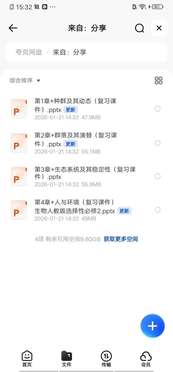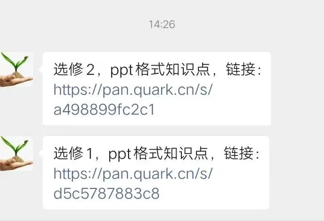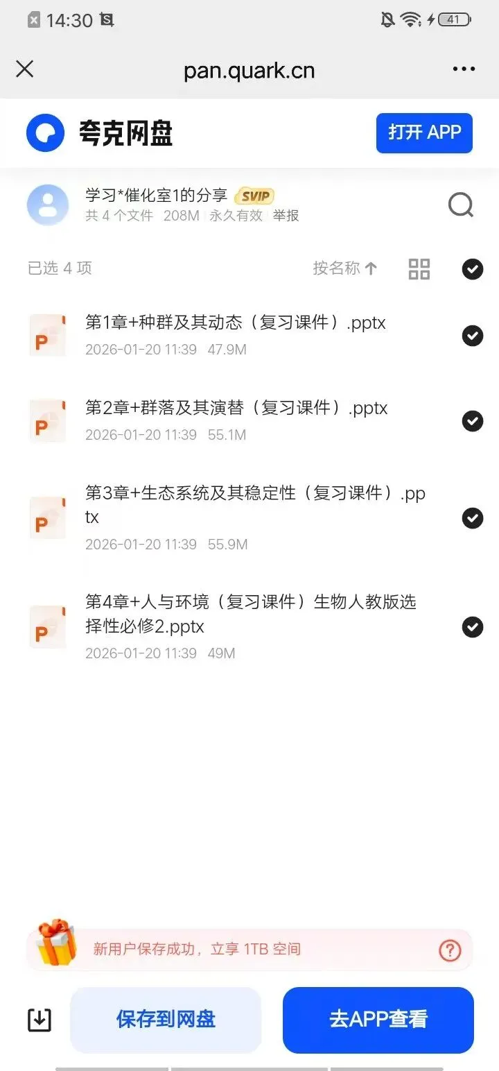 各位家长朋友们: 大家好!为了方便大家随时获取孩子的学习资料,我已经把整理好的**选修1、选修2复习知识点**上传到夸克网盘,并分享到了家长群里。 今天就带大家一步步操作,把这些资料转存到自己的网盘(没有的可以利用这次机会下载,免费的),以后随时都能下载、打印,再也不用担心资料过期或找不到啦! 🔍 第一步:接收家长群里的分享链接 首先,在家长群里找到我发送的资料链接(就像这样👇),或者二维码,点击链接或扫码即可进入夸克网盘的分享页面。 📂 第二步:进入网盘分享页面,选择需要的文件 点击链接后,会直接跳转到夸克网盘的分享列表。这里能看到所有我分享的学习资料,比如“第1章+种群及其动态(复习课件).pptx”等。系统会默认帮我们勾选全部文件,大家也可以根据需求自行选择。点击下面的“保存到网盘”。进入下一步。 🔑 第三步:登录夸克网盘账号 要转存文件,需要先登录自己的夸克账号。可以选择**手机号登录**(输入手机号+验证码),也可以直接用**微信登录**(点击绿色微信图标,授权即可)。记得勾选“请阅读并同意《用户协议》和《隐私政策》”哦。 ✅ 第四步:保存文件到自己的网盘 登录成功后,点击“保存到网盘”按钮,稍等几秒就能看到“保存成功”的提示啦!这意味着资料已经安全存到您自己的夸克网盘里了。 📲 特殊情况处理:遇到跳转/下载提示怎么办? 如果您是在微信里打开链接,可能会遇到“请在浏览器中打开”的提示(就像这样👇),这是正常的,按照指引操作即可。 1. 选择在浏览器打开:点击提示里的“在浏览器中打开”,会跳转到手机浏览器的下载页面。 2. 下载并安装夸克APP:如果您还没安装夸克APP,按照提示下载安装包,完成安装即可。 📱 第五步:打开夸克APP,找到已保存的资料 安装完成后,回到手机桌面,找到“夸克”图标并打开。进入APP首页后,点击底部的“文件”标签,再找到“来自:分享”的文件夹,就能看到我们刚才转存的所有学习资料啦!需要打印的资料从这里选取下载到手机或电脑即可。1. 永久保存:转存后的文件会一直保存在您的网盘里,随时可以下载、查看,不用担心过期。 2. 免费使用:这些资料都是为孩子们整理的免费学习资源,请勿用于商业用途。 3. 问题反馈:如果操作过程中有任何卡顿或疑问,随时在家长群里@我,我会第一时间帮您解决! 大家学会操作,可以提前关注本公众号,日后更多的学习资源通过这个渠道分享给大家!希望这份指南能帮大家轻松搞定资料转存,让孩子的学习更高效、更省心💪!