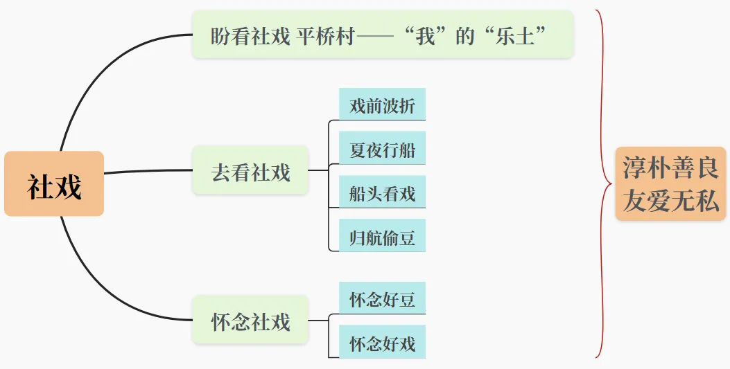 真的,一直到现在,我实在再没有吃到那夜似的好豆,——也不再看到那夜似的好戏了。【怀念社戏,起到了点明中心的作用。豆与社戏主观上的感觉变化象征着童年纯真和乡土生活的逝去。】【延伸:文末双重否定"再没有...也不再..."构成时空闭环,暗示现代化进程中精神原乡的永恒失落。这种怅惘不仅属于个人记忆,更是整个民族在转型期的集体乡愁。】