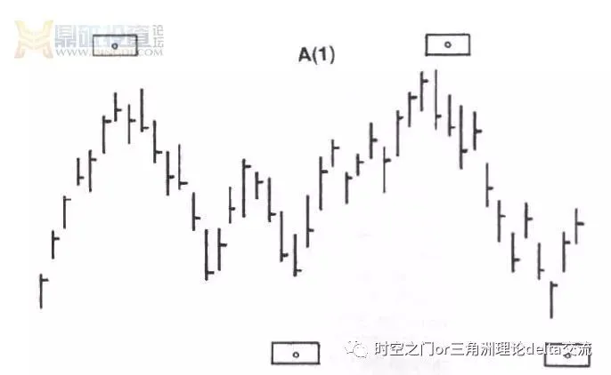 这种DELTA特性属于五种时间结构【共有】,其他转向点都没有这个特点。这种独特性是非常有用的信息。这个特点在低点比高点更普遍。当你研究下面的图表时,请注意这个特点,看看在点(1)的位置有多少主要的低点。