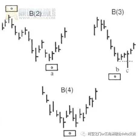 (2)真实的–有时候,市场会有两个差不多等值的高点,或者低点。当时最接近预测点的高点/低点,就是“真实的”DELTA转折点。如【图3-2】例B(2)所示,DELTA转折点就是最低点(a)。例B(2)的一点变化如例B(3)所示,一般可能认为转折点是最低点(c),但是,这不是事实,【事实是】“真实的”转折点在(b)点。进一步的细查表明,市场真的在(b)点转折然后上涨,而(c)点被放弃,【这】可能是由于市场被操纵,楼上交易者的强制止损等等。具有提示效果,或者使问题清楚的是(c)点股价范围的上半部分的高位收盘。当股价沿着实际启动于(b)点的趋势方向,收盘于高位,【(c)点价格】在前期低点下方的那部分应该被忽略。