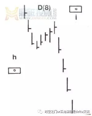 (4) 强势的–在前面的例子里,我们着重分析强势市场里的弱势一边。最后一种分类分析强势市场里的强势一边。再次强调一点,强势是指市场运动的任何一个方向,包括涨跌。【图3-4】例D(8)显示了一个典型的强势市场。它“试图”在DELTA转折点(h)点形成转折,但是当时的市场力量是如此强大,以至于它越过了转折日。最终,压力得到暂时减轻,并且市场开始朝DELTA高点(i)运动。有时候,这个点(i)可能会因为前一个点的穿越而准时到达,但是,交易者应该更多会看到它提前出现,因为市场内在的力量可能还是很强大。