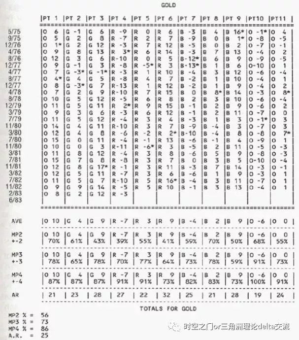 (5)精确度。下一个我想知道的问题是,“序列中的一个点与平均点之间的平均天数是多少。”行AR给出了每个点的结果。AR的计算方法是:取每个点出现的日期,计算其与平均点出现的日期之间的天数D,然后累计天数D,再除以累计的次数,最后再乘以10。计算结果是一个2位数。例如说,黄金的点(1)的AR是21,这就是说点(1)出现的日期,与平均点的日期之间的平均天数是2.1天。