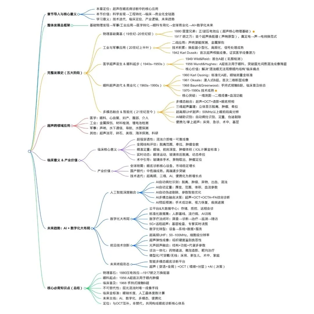 超声技术发展史:基础发现 → 工业与军事应用 → 医学转化 → 眼科专用设备诞生 → 全球商业化 → 未来趋势(AI+数字化) |