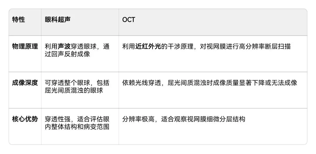◦例如,超声可穿透屈光间质混浊的眼球,显示视网膜脱离的范围,而OCT可清晰显示黄斑区的细微结构,二者结合可更全面评估病变。
