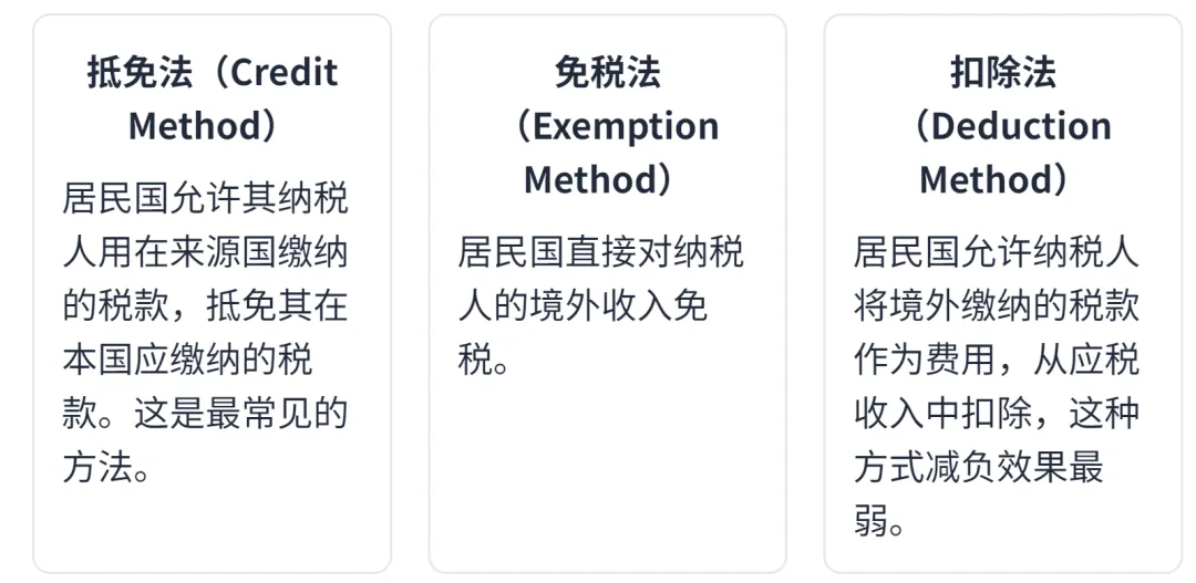 现实中,绝大多数国家都采用"居民地"与"来源地"相结合的混合税制,这不可避免地导致了国际双重征税(Double Taxation)的问题。即同一笔收入,既被来源国征税,又被居民国征税。为了解决这一全球经济发展的障碍,各国之间广泛签订了《避免双重征税协定》(Double Taxation Agreements, DTA)。协定通常通过以下方式消除或缓解双重征税:分享HK上市公司咨询顾问覃荣在咨询过程中常见的案例: