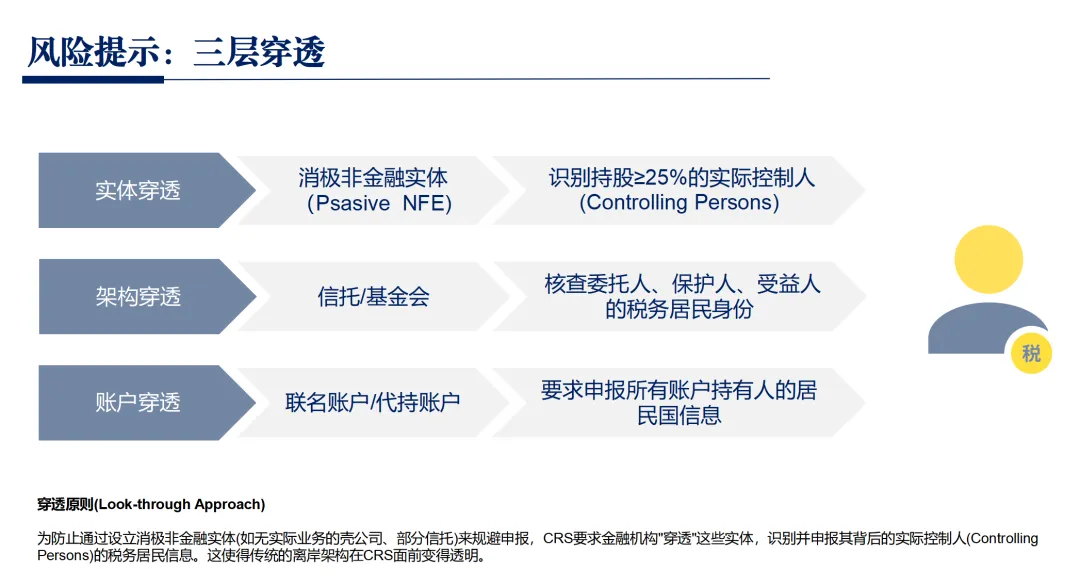 - 实体穿透根据CRS规则,对于由非金融机构(如王总的BVI控股公司)持有的金融账户,银行需要"穿透"该公司,识别并申报其背后的"控制人"(Controlling Persons),即王总本人。