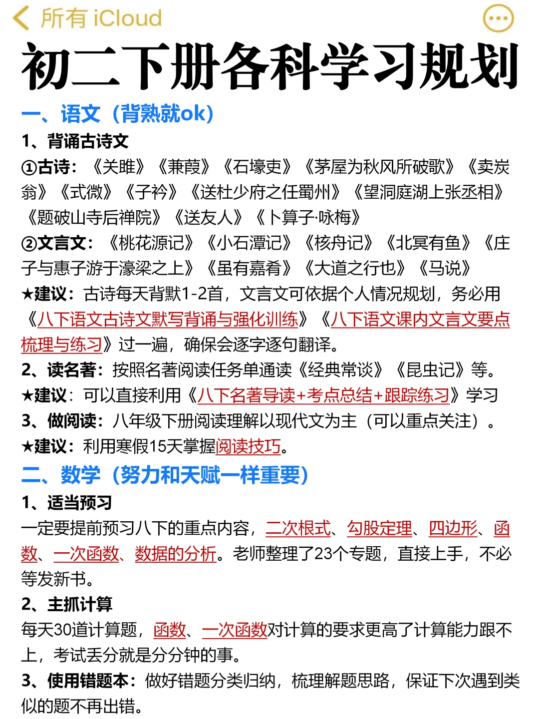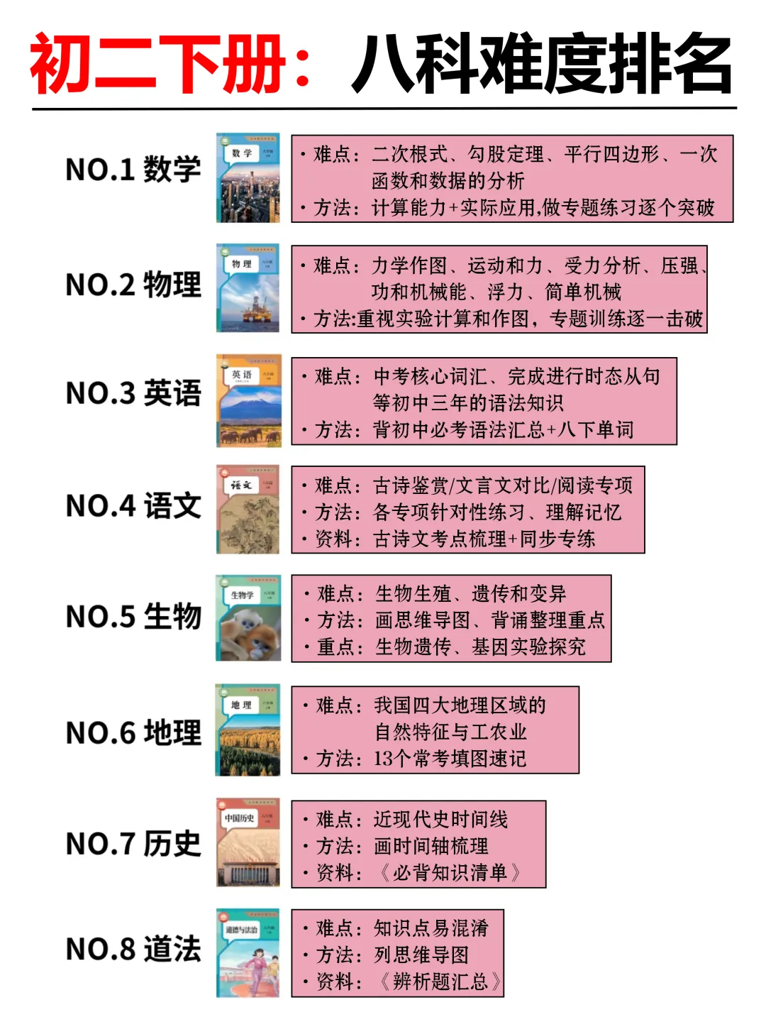 今天老师给大家分享的是【八年级下册八科难度排名+详细学习规划(附配套学习资料)】,寒假没拿到课本的可以依据老师整理的核心考点进行预习噢~寒假直接把握住重点,假期结束不论是开学考试还是月考都能轻松拿捏!家长可以给孩子打印下来练习呢!