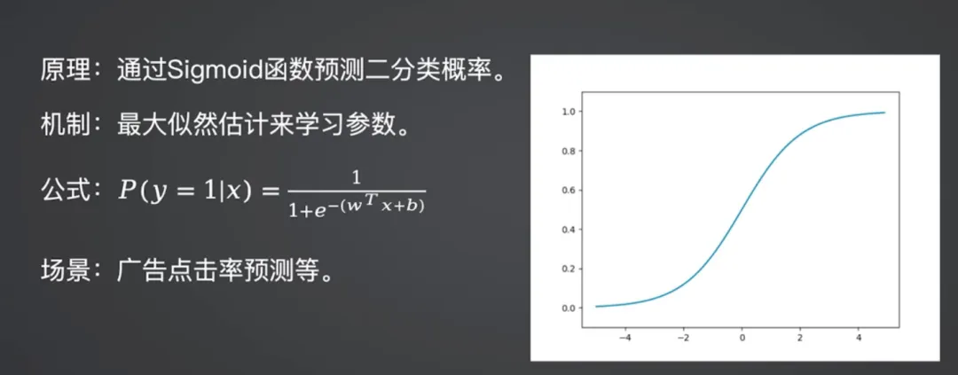 逻辑回归基于线性回归扩展,通过Sigmoid函数将输出映射到0~1区间,实现二分类概率预测,是高维稀疏数据分类的首选基线算法。