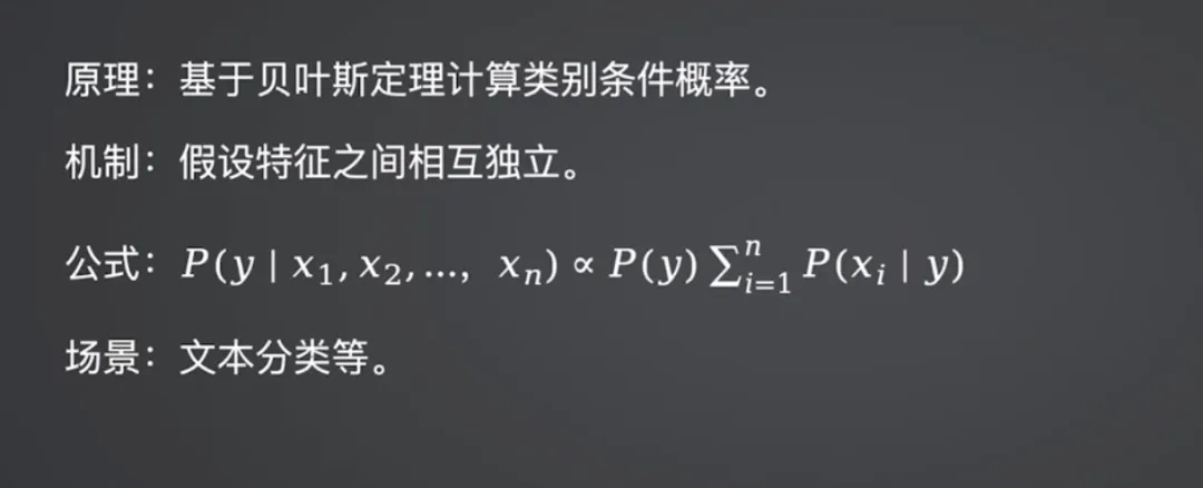 基于贝叶斯定理,假设特征独立,训练/预测速度极快,对文本类高维稀疏数据友好。