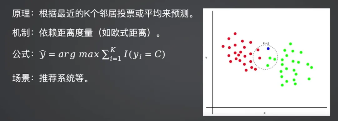 核心是“物以类聚”,无需训练,新样本类别由最近K个邻居决定,适合小样本、低维数据。