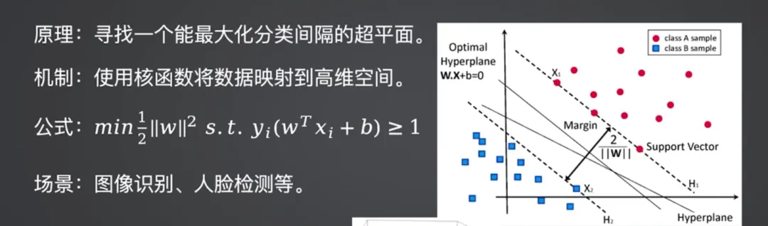 寻找最优超平面最大化类别间隔,通过核函数处理非线性数据,高维小样本下精度突出。