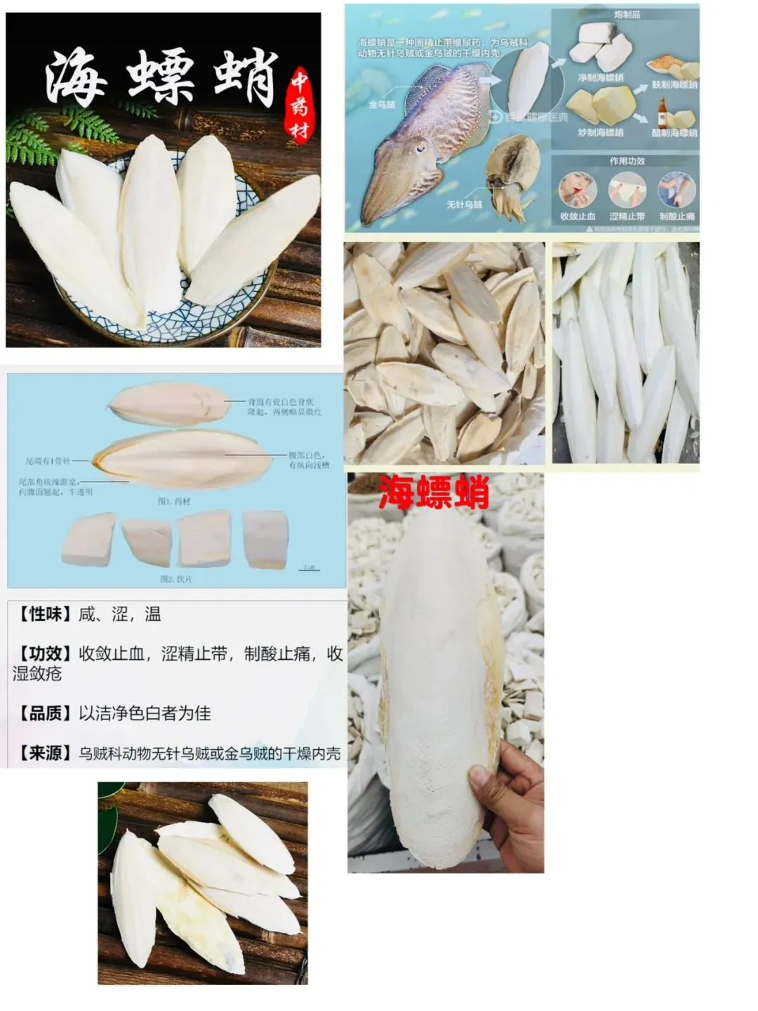 (4)联想记忆:名为“蛸”,实为“骨”。其腹面致密的横纹是其形态精髓。性温收敛,既能固摄下焦(遗精、带下),又能中和上焦(胃酸),内外出血皆可治,为收敛止血之良药。