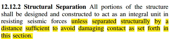 12.12.2控制结构之间的间距structural separation,由这个允许地震设计位移δDE控制,通过12.8.6节,那么建筑之间的间距就是通过SRSS(平方和开放)两个建筑的最大地震位移来确定:
