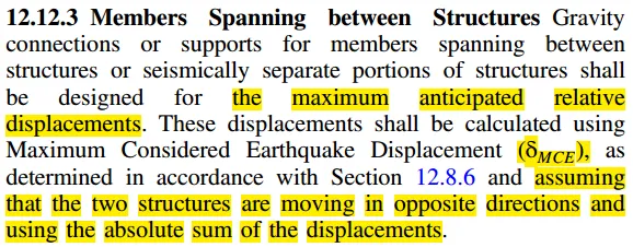 12.12.3控制跨不同结构的重力连接或支撑构件的位移,gravity connections or supports for members spanning between structures or seismically separate portions of structures,其实就是举例连廊,悬挑的构件,它的设计要求是要考虑两个结构单元朝着相反运动方向(最不利情况),使用最大考虑地震位移,并且通过绝对值相加,来确定相对位移限值。