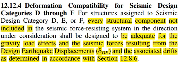 12.12.4是抗震设防等级SDC-D~F的变形协调要求,其实就是非地震力抵抗体系的受力构件也要有足够的强度能够抵抗重力和地震力(由设计地震引起的δDE)协调作用从而产生的变形引起的附加内力。