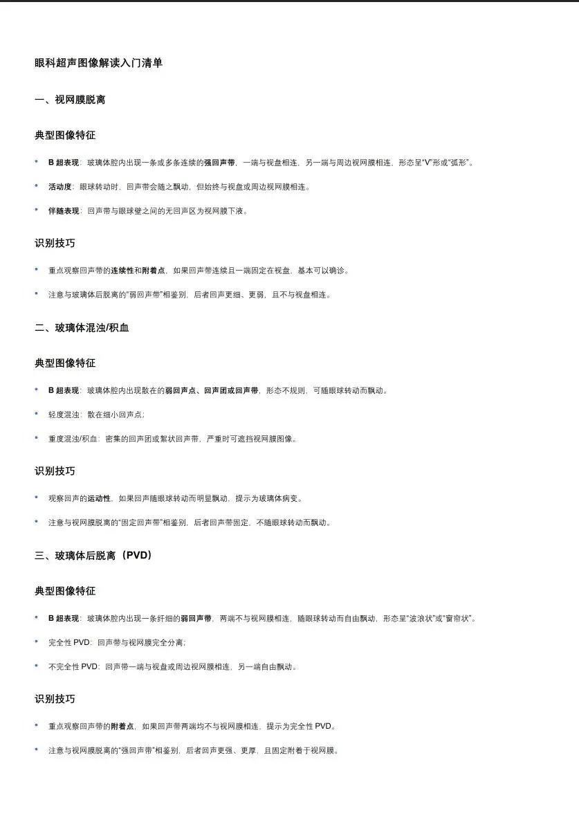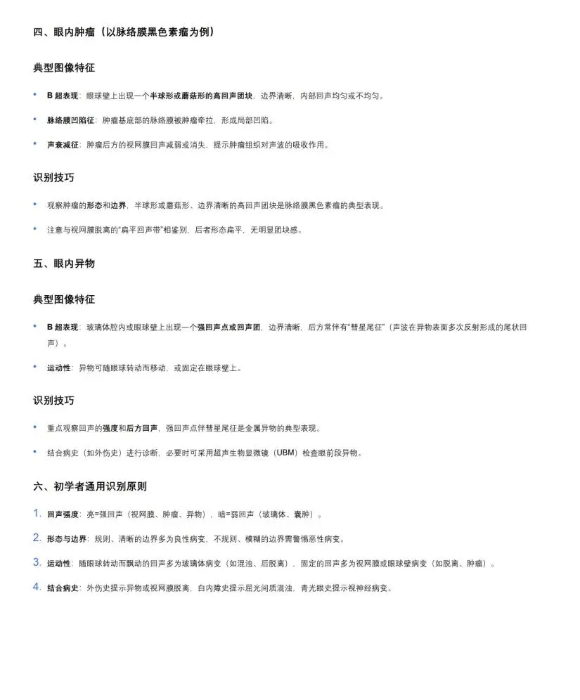 ◦初学者提示:B超图像是二维的,能直观显示眼内结构的形态和病变的位置。例如,视网膜脱离表现为玻璃体腔内的连续强回声带,一端与视盘相连,另一端与周边视网膜相连。