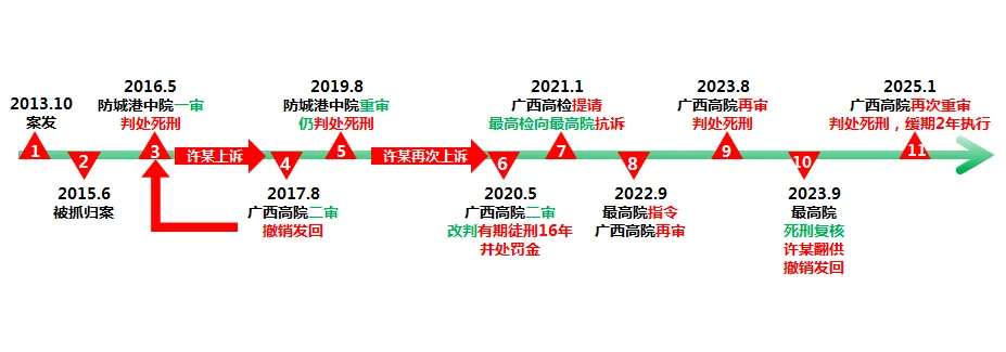 6.2023年8月:广西高院作出再审判决,以“许某犯运输毒品罪判处死刑,与抢劫罪、非法持有毒品罪数罪并罚,决定执行死刑”。最高院死刑复核期间,许某承认其受人指使运输毒品的犯罪事实,需要进一步查证,最高人民法院发回重审。