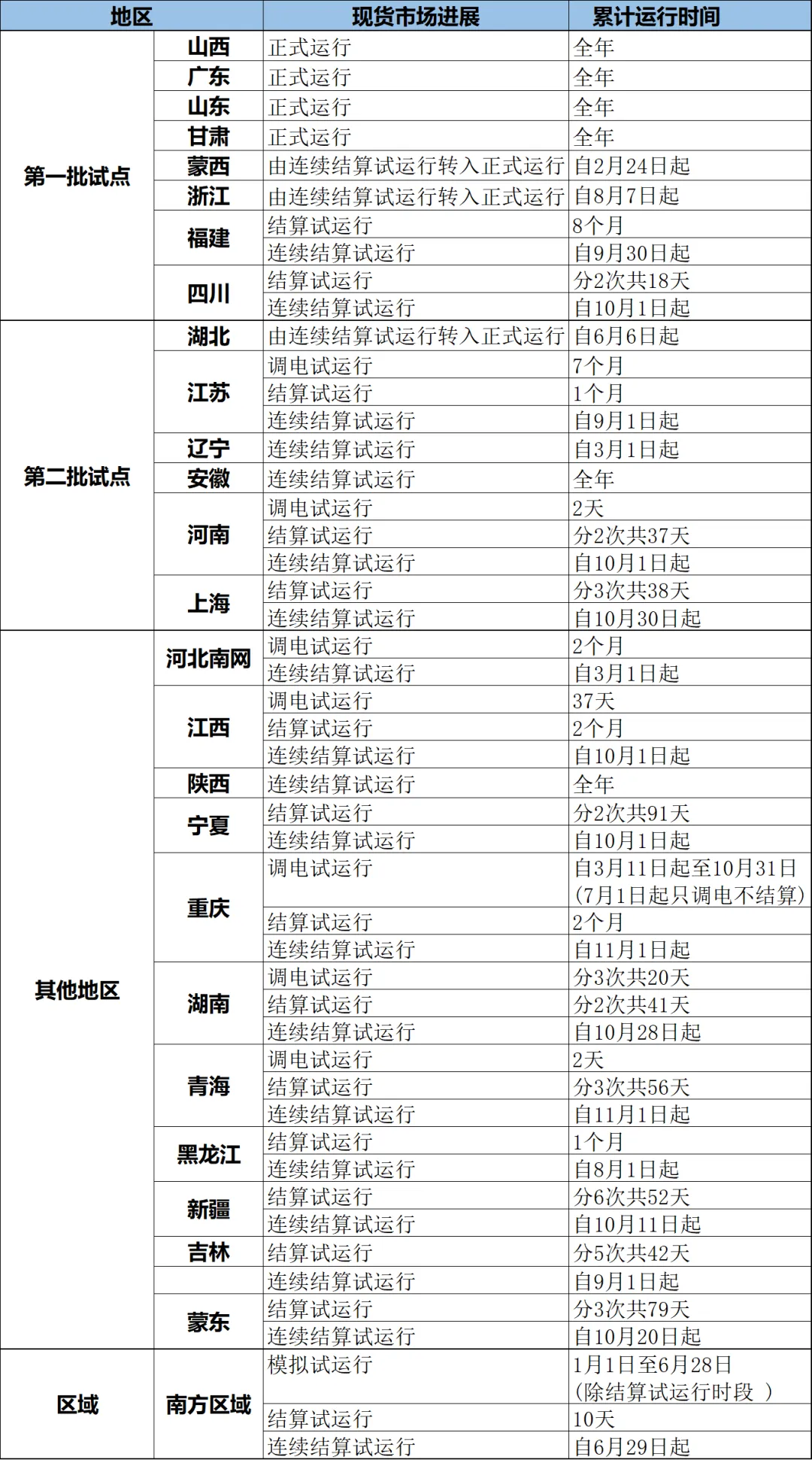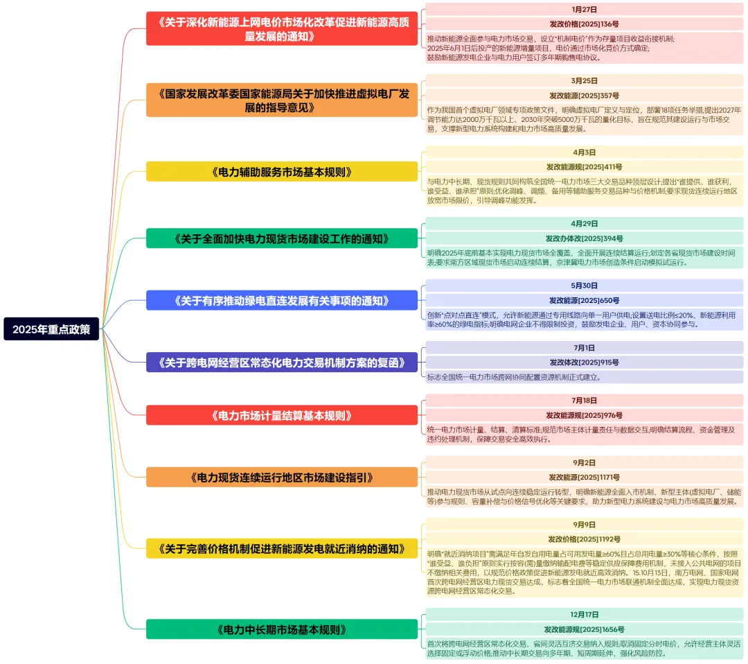 394号:明确了全国电力现货市场建设的时间表,核心要求包括2025年底前基本实现电力现货市场全覆盖、全面开展连续结算运行;同步推动南方区域电力现货市场启动连续结算,京津唐电力现货市场创造条件启动模拟试运行。政策落地成效显著,2025年我国电力现货市场建设实现关键跨越,除京津唐和西藏外,其余地区均已纳入现货市场覆盖范围。