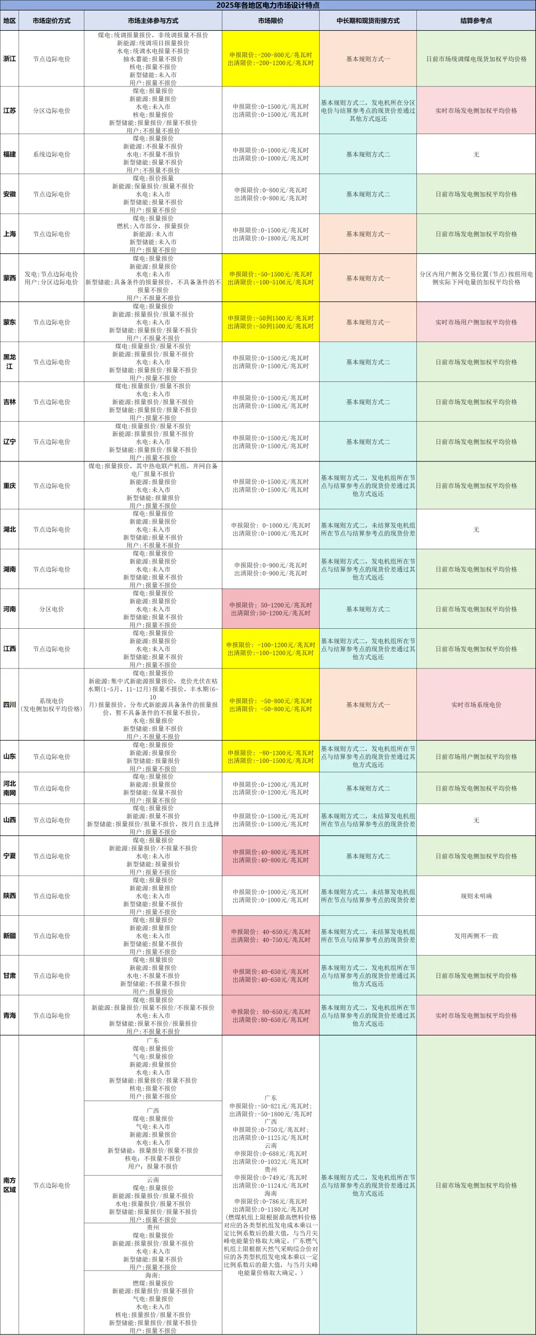 价格上下限:出清下限为负的地区共7个,分别为浙江、蒙西、蒙东、江西、四川、山东、广东,下限区间介于-200元/兆瓦时至-50元/兆瓦时之间;出清下限为正的地区共5个,包括河南、宁夏、新疆、甘肃、青海,下限区间为40元/兆瓦时至80元/兆瓦时;其余地区出清下限均设定为0;结算下限为正的地区1个,为江苏(200元/兆瓦时)。