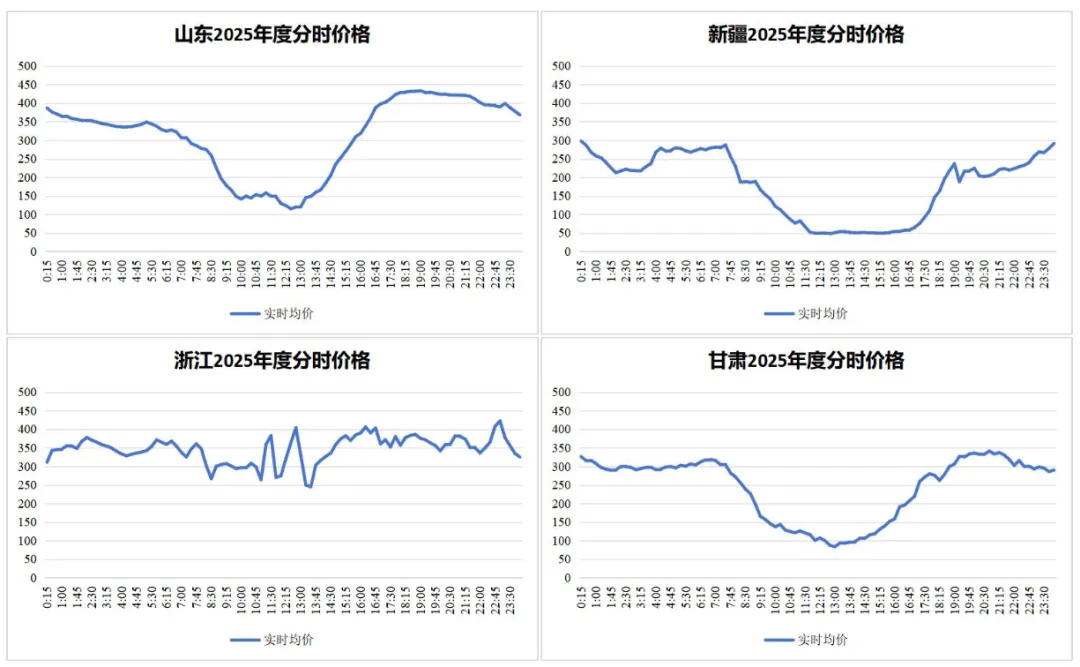 从2025年各省全年分时价格曲线来看,区域特征差异显著。新能源高占比省份“午低晚高”的曲线特征持续固化,山西、山东、甘肃呈现典型的“鸭子型”曲线,午间因新能源大发叠加负荷低谷形成价格深谷,晚间负荷攀升叠加新能源出力衰减推动价格冲高;新疆则呈现“澡盆型”曲线,低谷时段跨度更长。东部负荷中心省份分时价格曲线则以窄幅波动为主要特征,如浙江分时价格整体走势平稳,仅傍晚时段因供需偏紧出现短期高位波动。